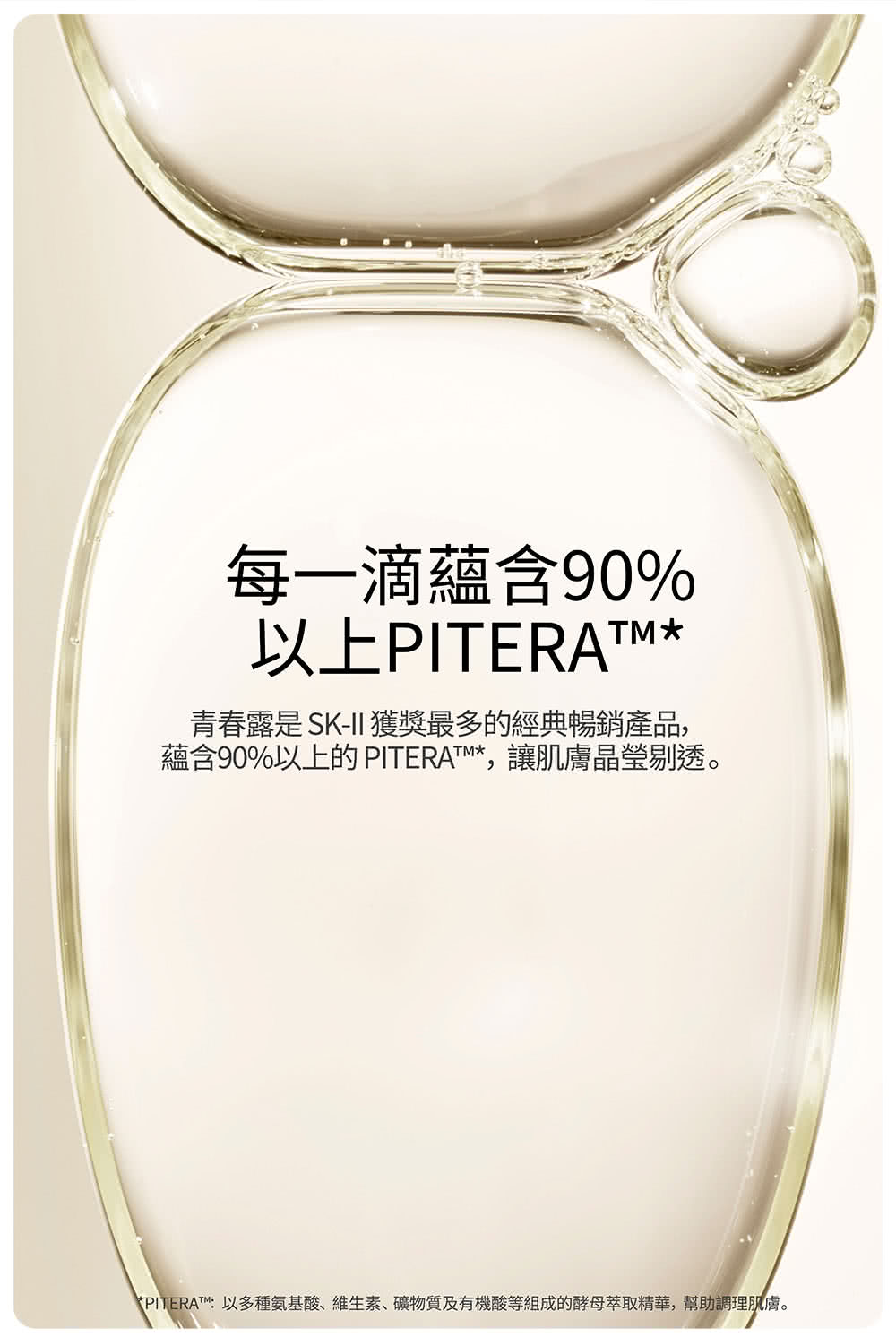 SK-II護膚精華含92.7% 天然活膚酵母精華 PITERA™,促進肌膚新陳代謝正常化,具有調整肌膚酸鹼值平衡以及修護的效果。這種源於大自然的成分蘊含豐富維他命、胺基酸和礦物質等50多種活性成分